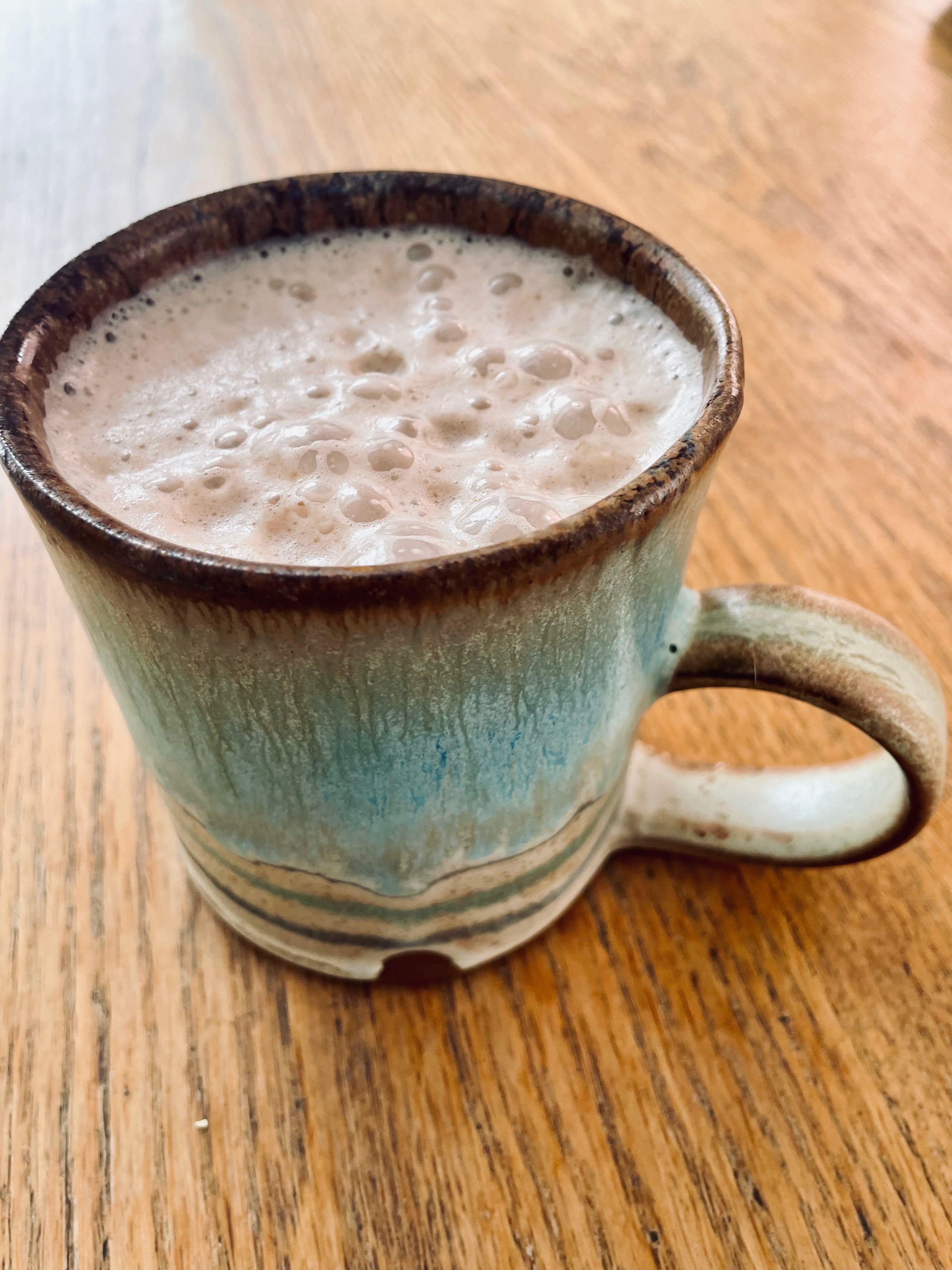 Here’s the recipe: brew a large mug of peppermint herb tea (I like most brands of it). In a blender, whiz up the hot tea with a splash of milk (any kind, I use whole dairy), a pinch of salt, a pitted date, and a heaping teaspoon of cacao or cocoa powder. Now lower your expectations. So good! (Probably even better if you dunk a wee shortbread into it.)