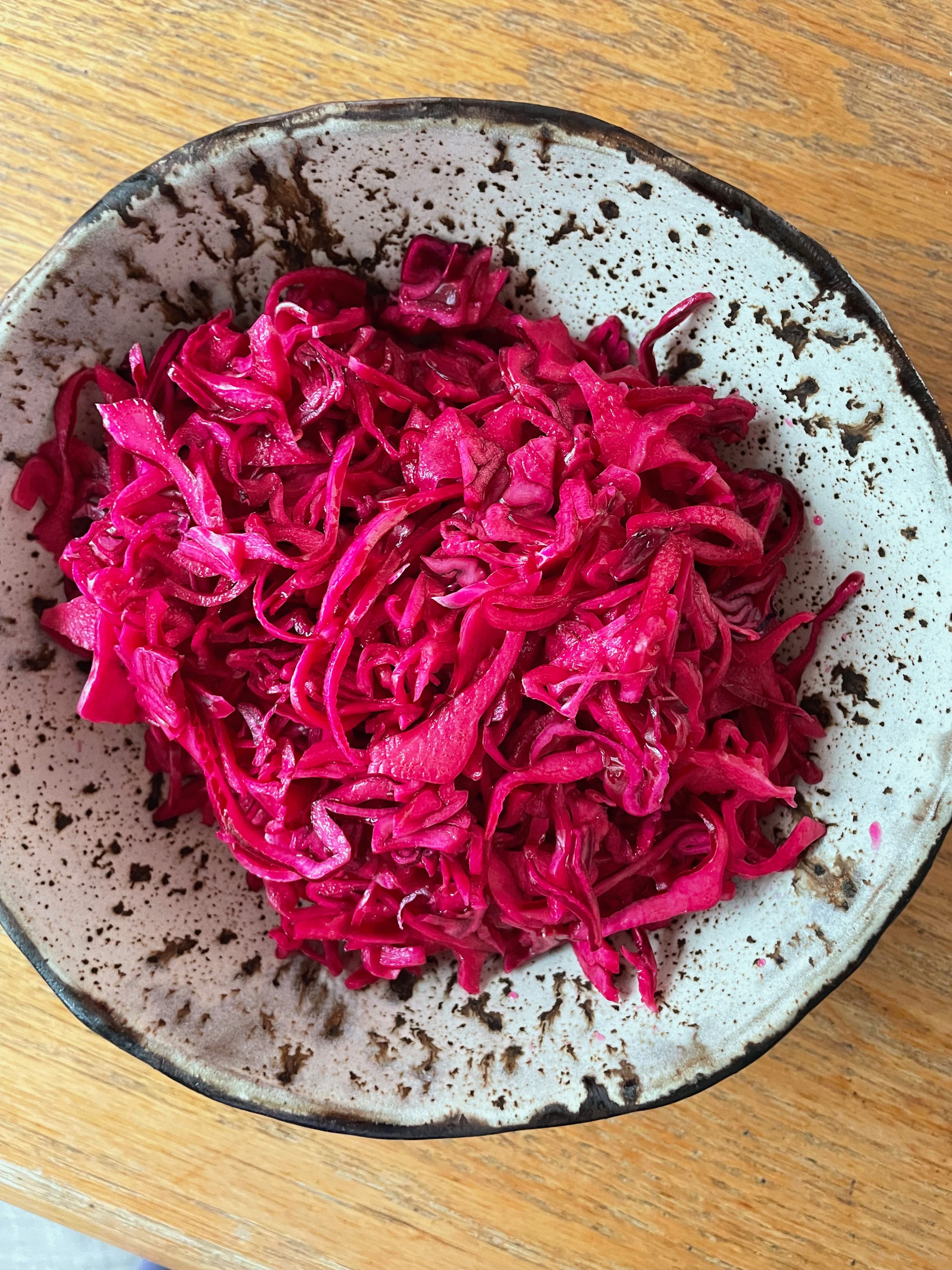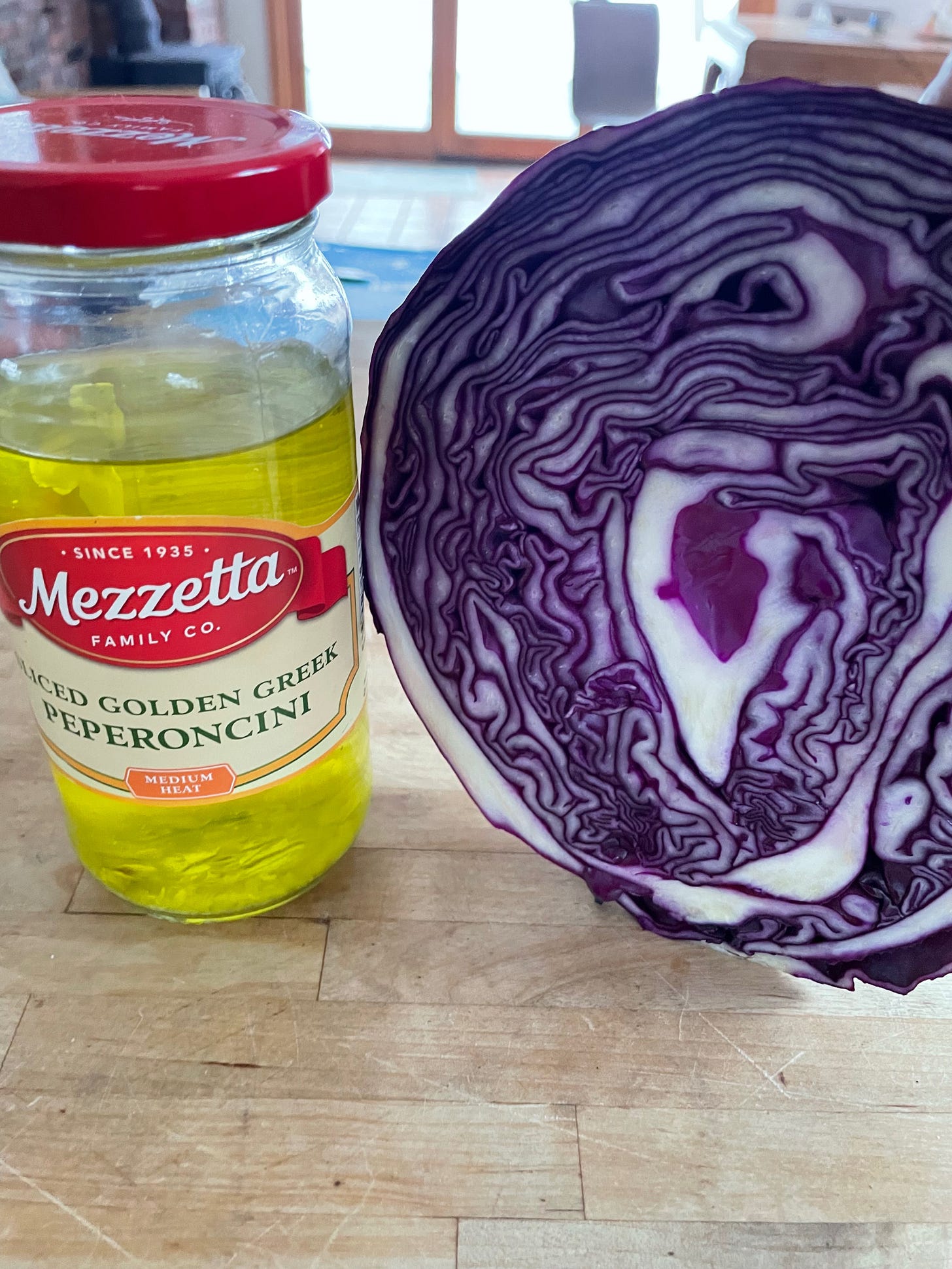 Oh my god it’s so perfect! Perfectly seasoned without any added salt even—just the brine left in a jar that has been emptied of its peperoncinis. Toss it with tongs or your hands, then leave it under a weight in the fridge overnight or for at least 2 or 3 hours—it will give up a lot of juice and end up covering itself in brine even if it doesn’t seem like it will. It keeps well and, in fact, gets better and better, though I tend to eat all of it fairly quickly because it’s the perfect gorgeous garnish for nachos, bean or grain bowls, hot dogs, quesadillas, and scrambled eggs.
