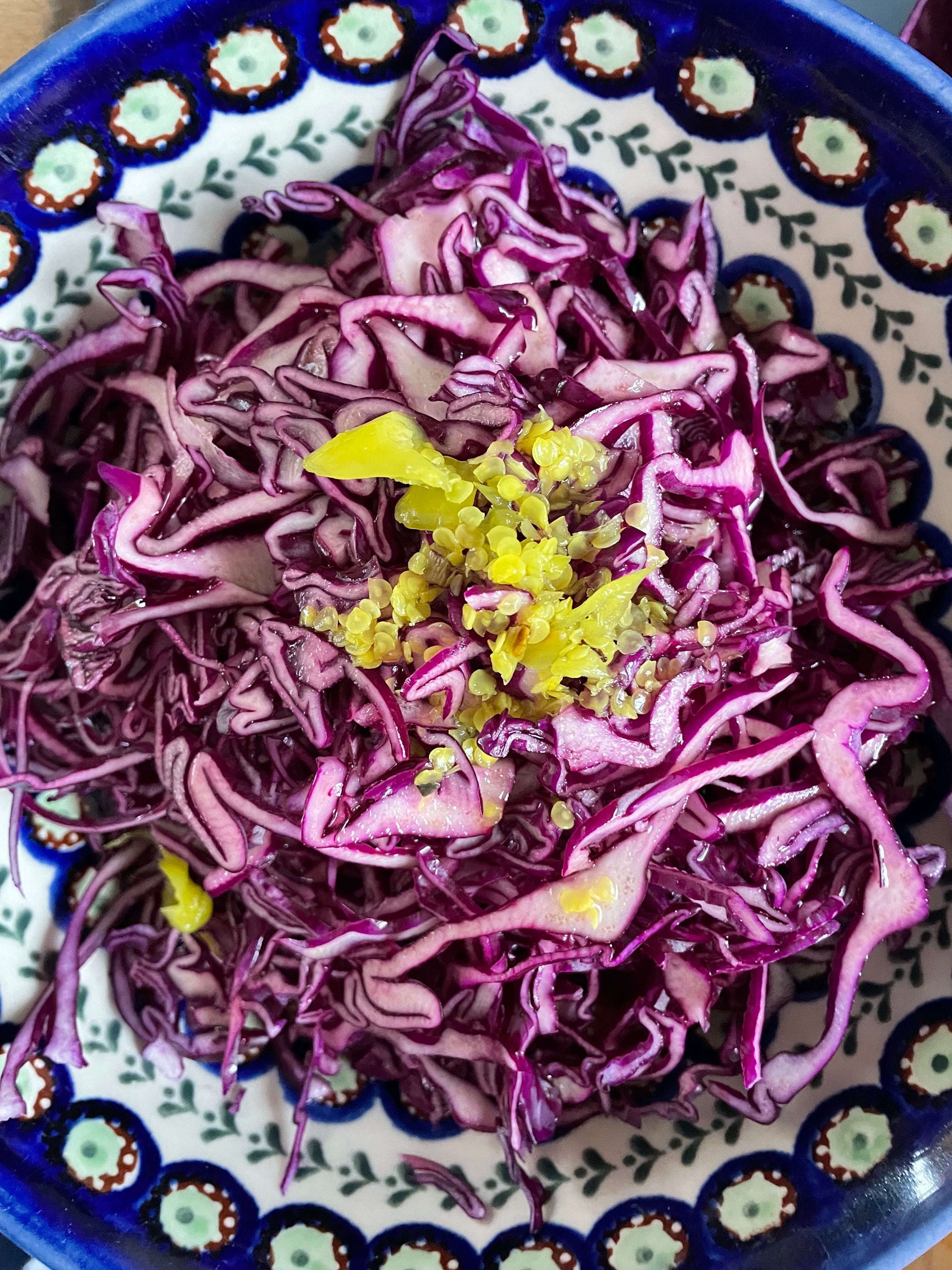 We really mostly eat this salad (like, 3 or 4 nights a week, with just green cabbage as this base of it), but I’ve also been making this black pepper beef and cabbage stir-fry, only I do it with firm tofu that I press then cube, toss with 1 tsp salt, 1 tbs crushed black pepper, 1 tbs cornstarch, and 1/2 tbs brown sugar, pan-fry, then follow the recipe-ish in terms of the cabbage and sauce. I add a dash of sesame oil or chili crisp, and sometimes sliced radishes and/or celery. Sorry, sorry that was annoying.