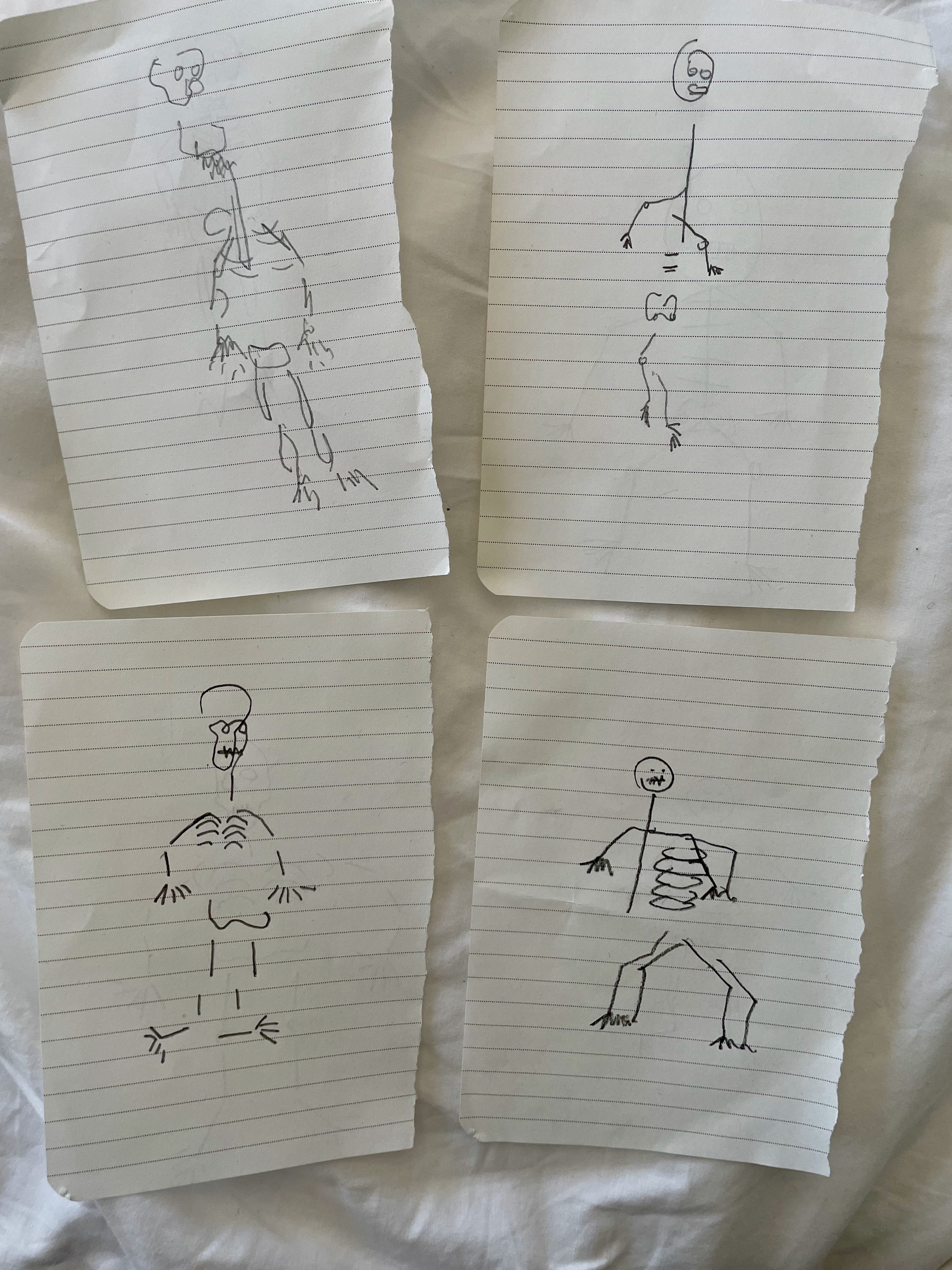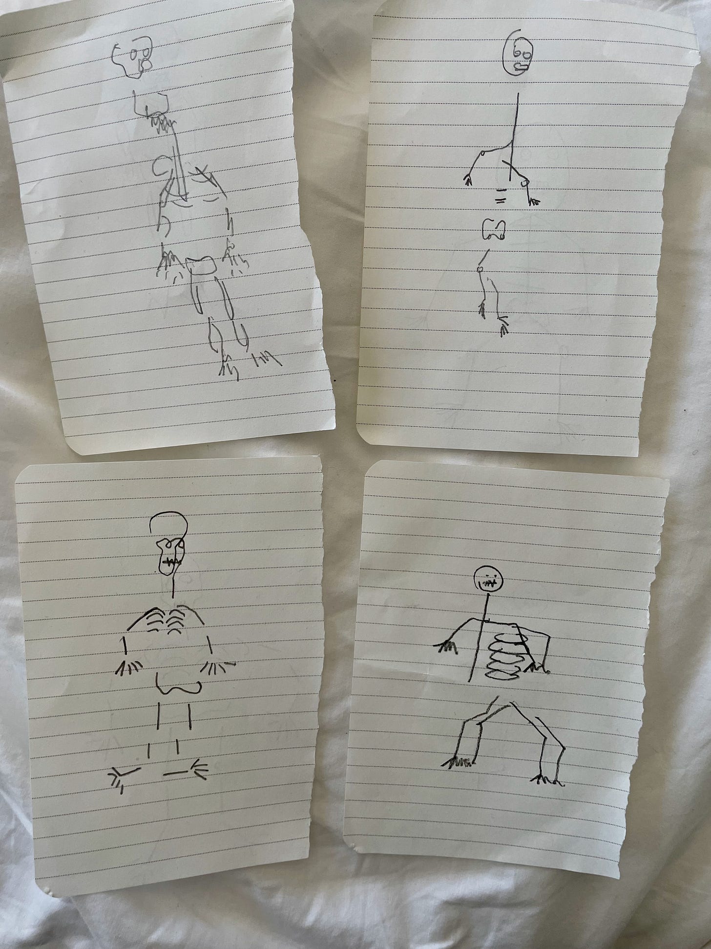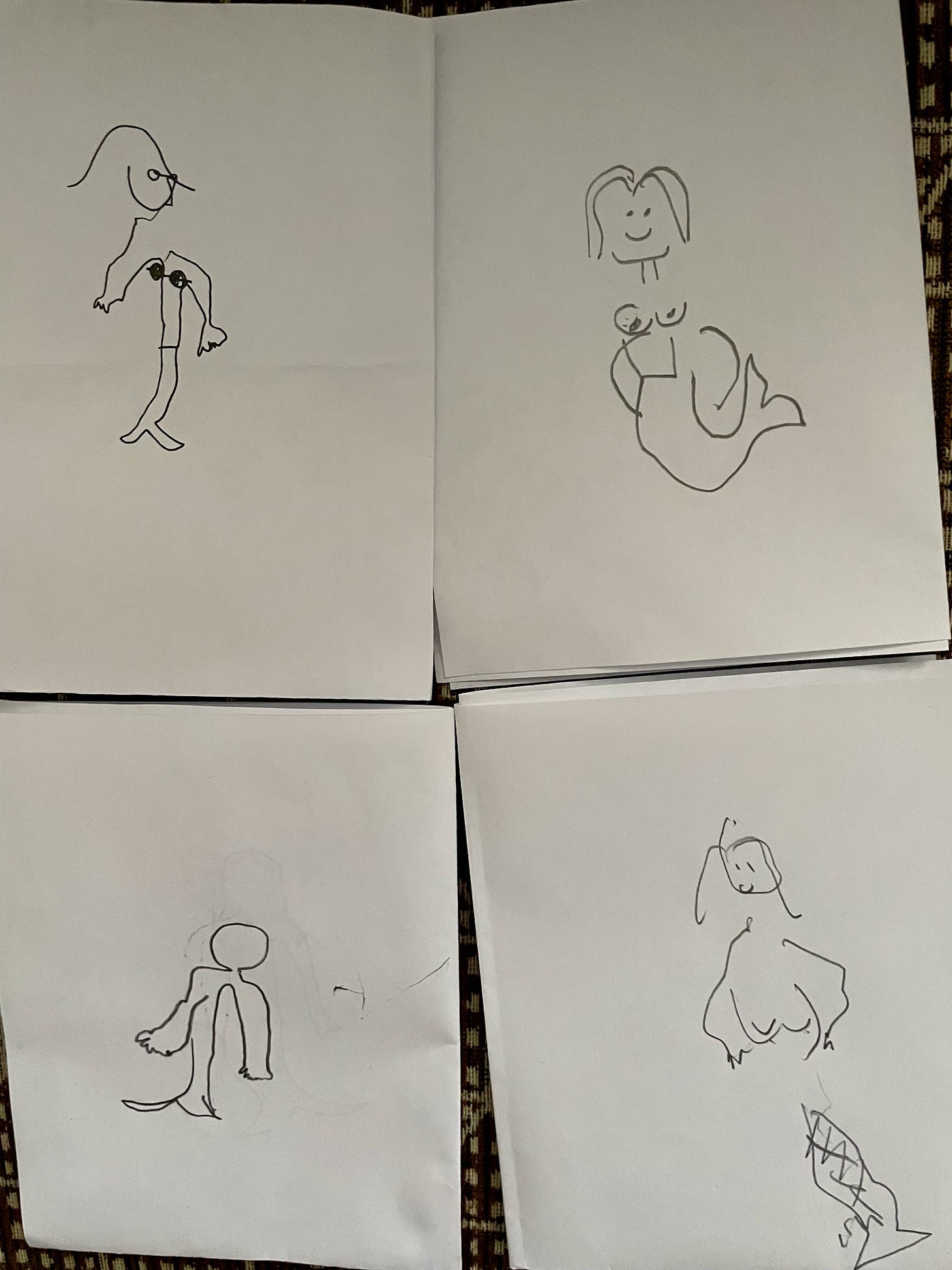Thing 2: Thanks to an instagram post by fabulous cartoonist Lynda Barry, we had the idea to do this drawing game on a recent vacation. We did skeletons, mermaids, and bicycles—first 1 minute with eyes open, then 30 seconds with eyes closed. Here are some of the eyes closed ones.